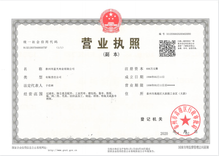 公司專業(yè)從事紡織業(yè)生產(chǎn)已三十多年,已成為一家從紡絲、織造、后整理到后加工一條龍的企業(yè)。公司位于江蘇省泰州市高港區(qū)大泗工業(yè)園區(qū),交通方便,占地100余畝,擁有現(xiàn)代化標準廠房,現(xiàn)有員工120人,年產(chǎn)過濾布300萬米、除塵布袋600萬米、縫包線、長絲線4...